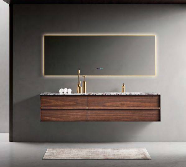 黑胡桃木的温润质感,搭配雪山银狐天然奢石台面,双盆设计搭配带金边的智能镜,把高级感直接拉满。悬浮式柜体 + 无封边工艺,2 米长的大尺寸完美适配大卫生间,暮秋时节的配色自带低调的贵气感。