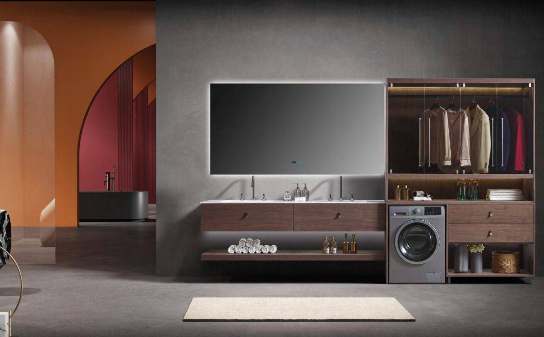 谁不想在家拥有五星级酒店的体验?这款浴室柜直接把洗衣、收纳、洗漱功能整合一体,胡桃木柜体搭配开放格 + 侧边洗衣柜 + 顶部衣柜,连洗护用品、换洗衣物都有专属位置,搭配智能镜,让卫生间的整洁度和质感直接翻倍。