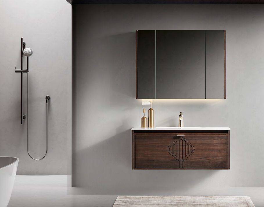 这款直接把宋式美学搬进卫生间!黑胡桃木柜体上的梅花纹雕花,搭配岩板卡拉拉白台面,细节里全是东方美学的留白感。镜柜自带美妆镜、除雾和手扫开关,实用又高级,小户型也能轻松 hold 住这份雅致。