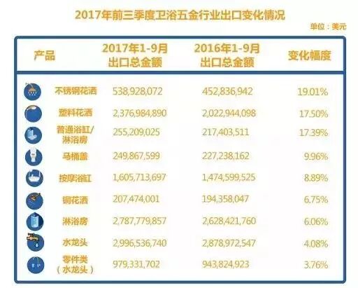 下表显示,2017年1月~9月,全国卫浴五金行业累计完成出口额119.98亿美元,同比增长8.67%。其中,全国卫浴五金行业中累计完成出口额较高的产品是水龙头、淋浴房和塑料花洒,行业各类产品前三季度出口额增速较快的是不锈钢花洒、塑料花洒与普通浴缸/淋浴房增速较快。