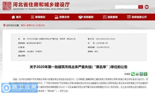 近日,河北省住房和城乡建设厅官网发布关于2020年第一批建筑市场主体严重失信(“黑名单”)单位的公告,具体内容如下: